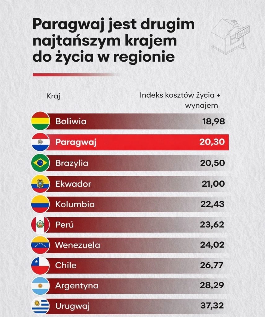 Z danych Numbeo wynika, że w 2026 roku Paragwaj zajmuje drugie miejsce w Ameryce Południowej pod względem najniższego kosztu życia i najmu, z indeksem 20,30. Ta liczba sama w sobie niewiele mówi – dopiero porównanie z innymi krajami regionu pokazuje jej realne znaczenie.